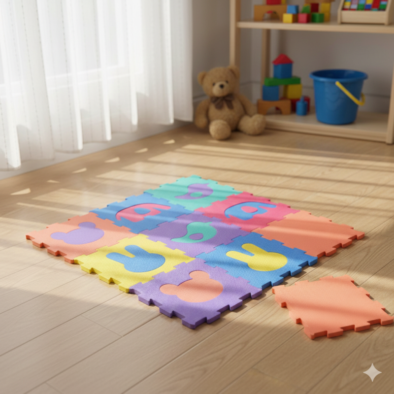 Декоративна постелка тип пъзел от 9 части с различни силуети на животни, изработени от висококачествен EVA материал в наситени цветове, които се сглобяват бързо и лесно.