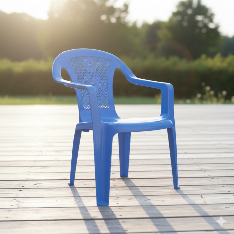 Функционално детско столче, изработено от трайна и безвредна пластмаса в син цвят с облегалка декорирана с картинка на Гуфи.