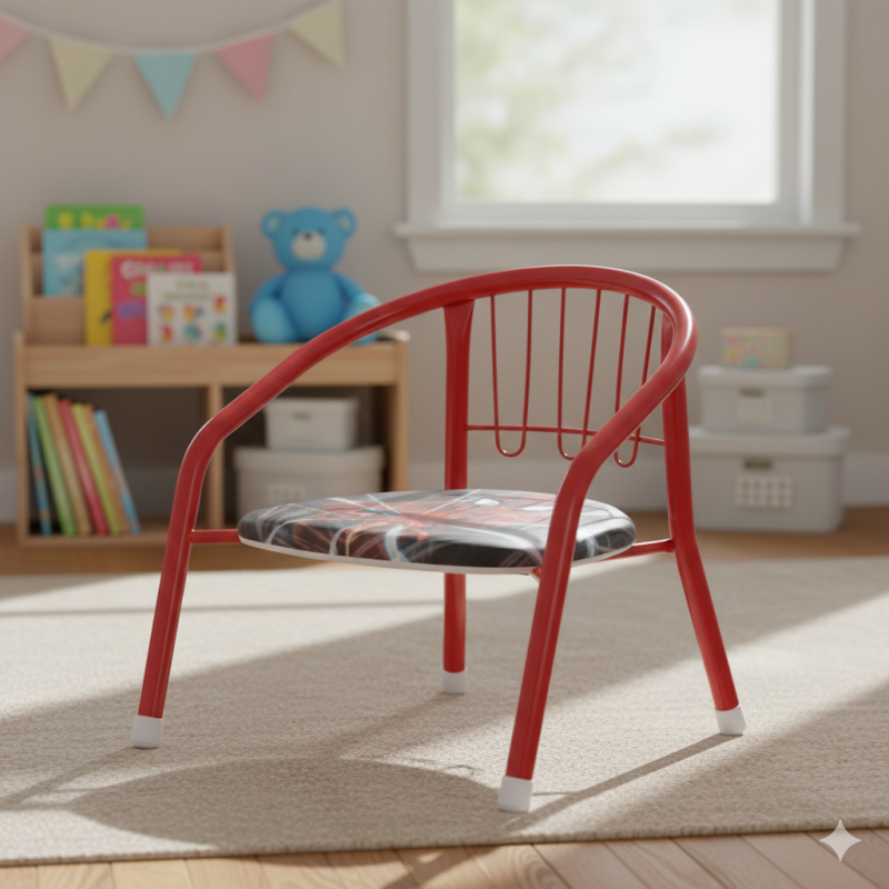Детски стол със стабилна метална рамка в червен цвят и противоплъзгащи подложки на краката. Седалката е мека и удобна с цветна щампа на Спайдърмен - Човека паяк.