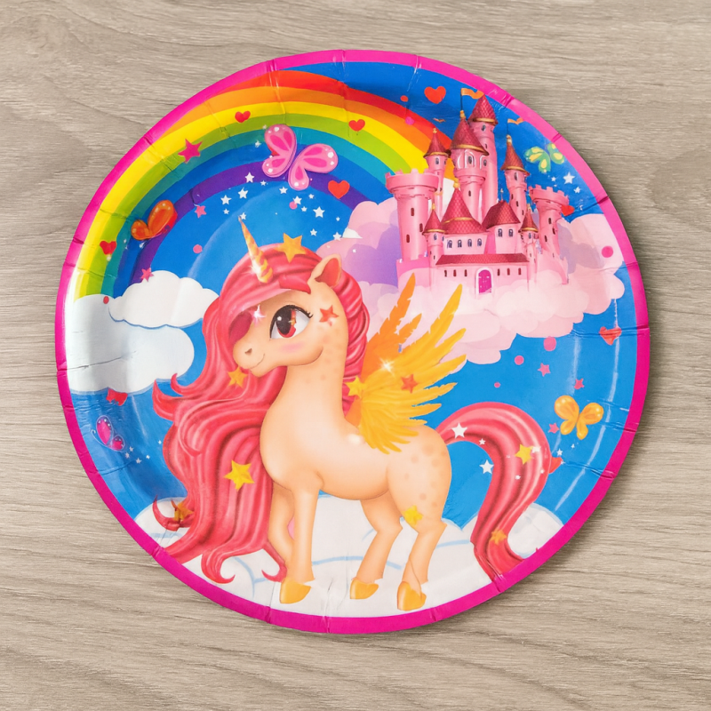 Комплект от 10 броя парти чинии с кръгла форма, изработени от картон с цветни картинки на еднорог.