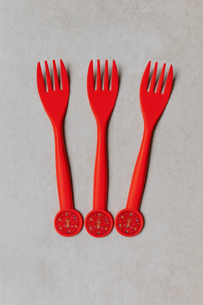 10 броя парти вилички за еднократна употреба, изработени от пластмаса в червен цвят с картинка на клоун.
