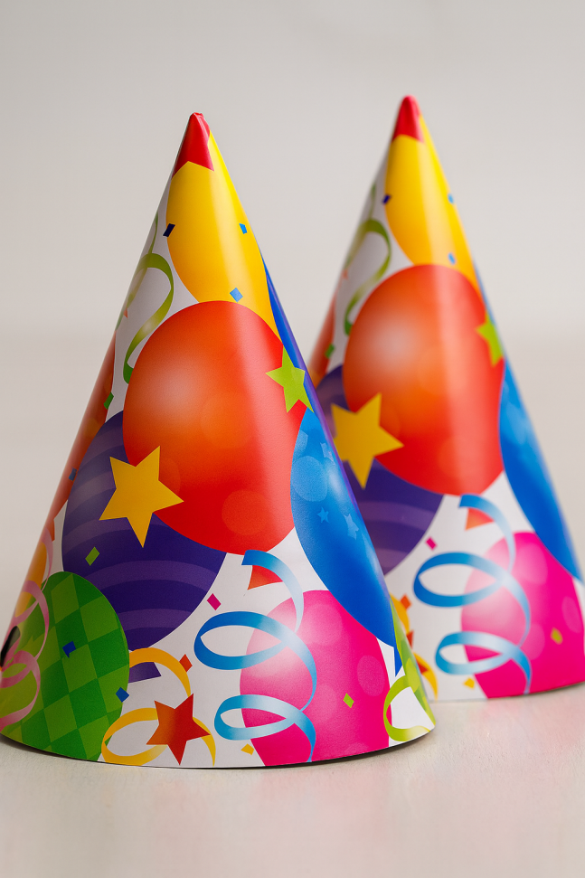 6 броя парти шапки с ластик, изработени от картон с принт на разноцветни балони.