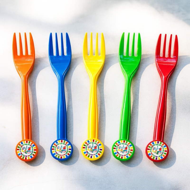 10 броя парти вилички за еднократна употреба, изработени от пластмаса в различни ярки цветове с надпис Happy Birthday.