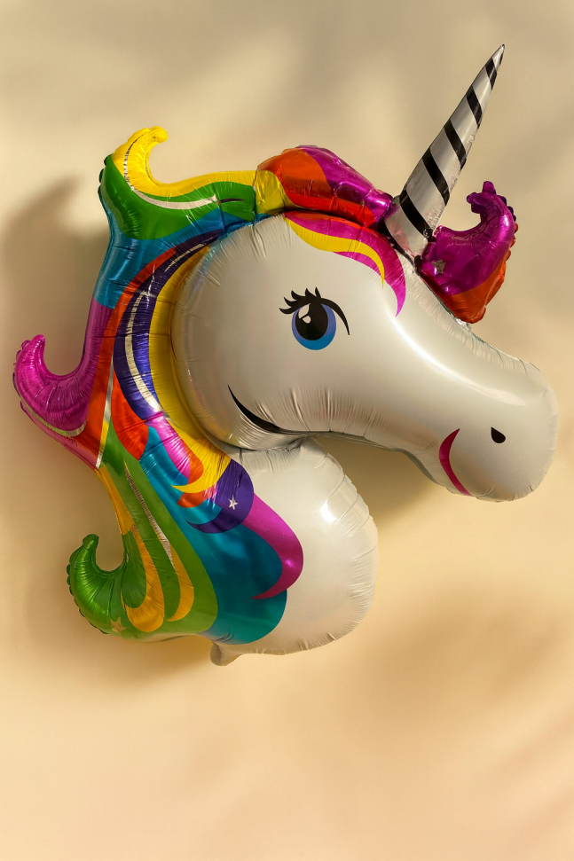 Голям парти балон във формата на глава на еднорог, изработен от фолио в ярки цветове.