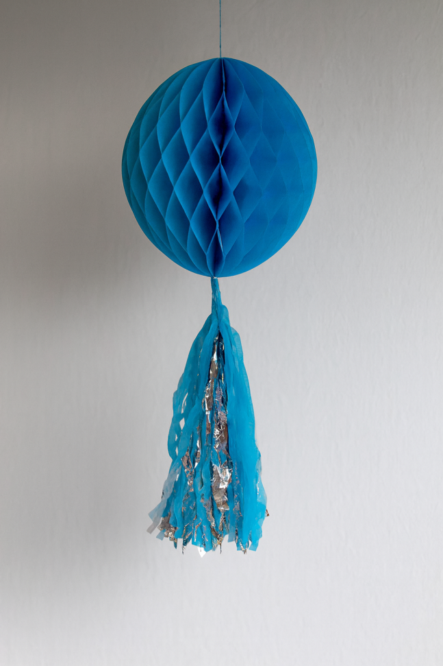 Висяща парти декорация във формата на топка с ресни, изработена от хартия в тюркоазен син цвят.