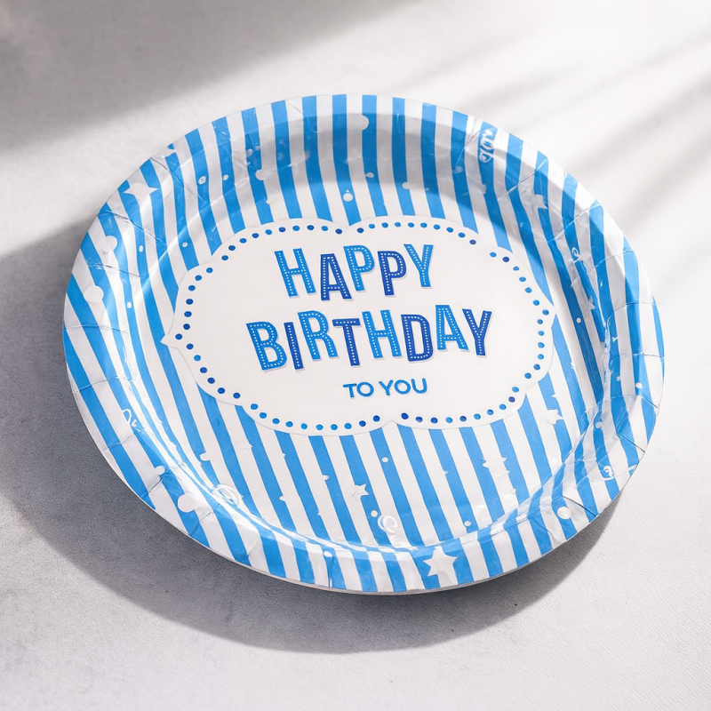 6 броя парти чинии с кръгла форма, изработени от картон в синьо-бяло райе с надпис Happy birthday.