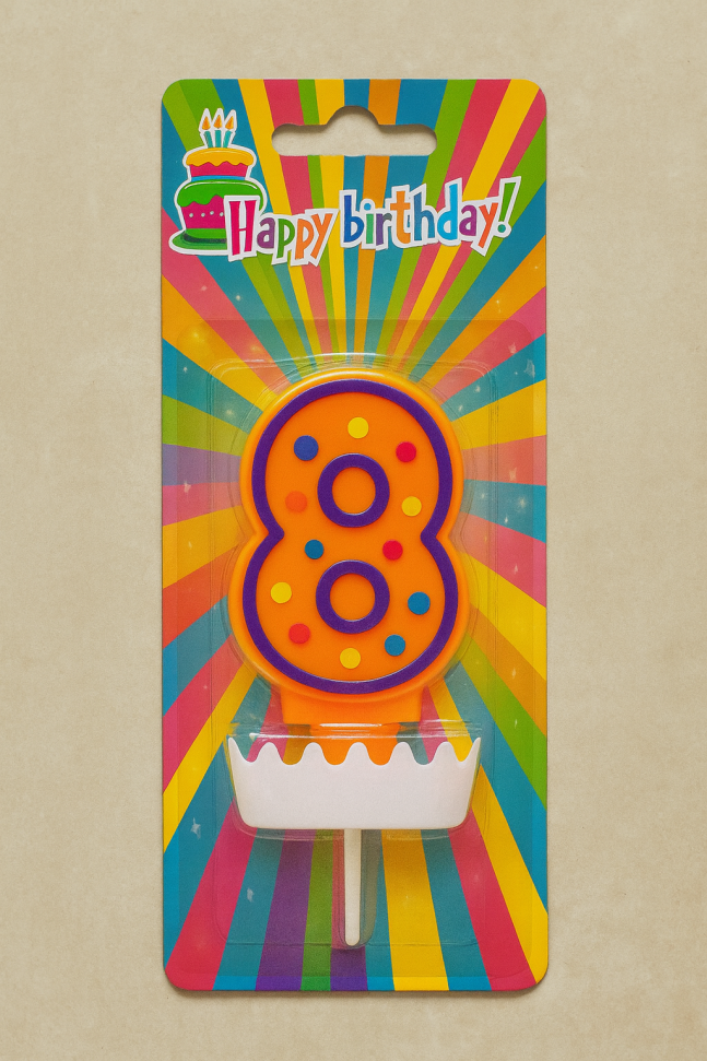 Празнична свещ с поставка за торта във формата на цифрата 8 в оранжев цвят с разноцветни точки, която ще бъде колоритно допълнение към всяко парти за рожден ден на дете.