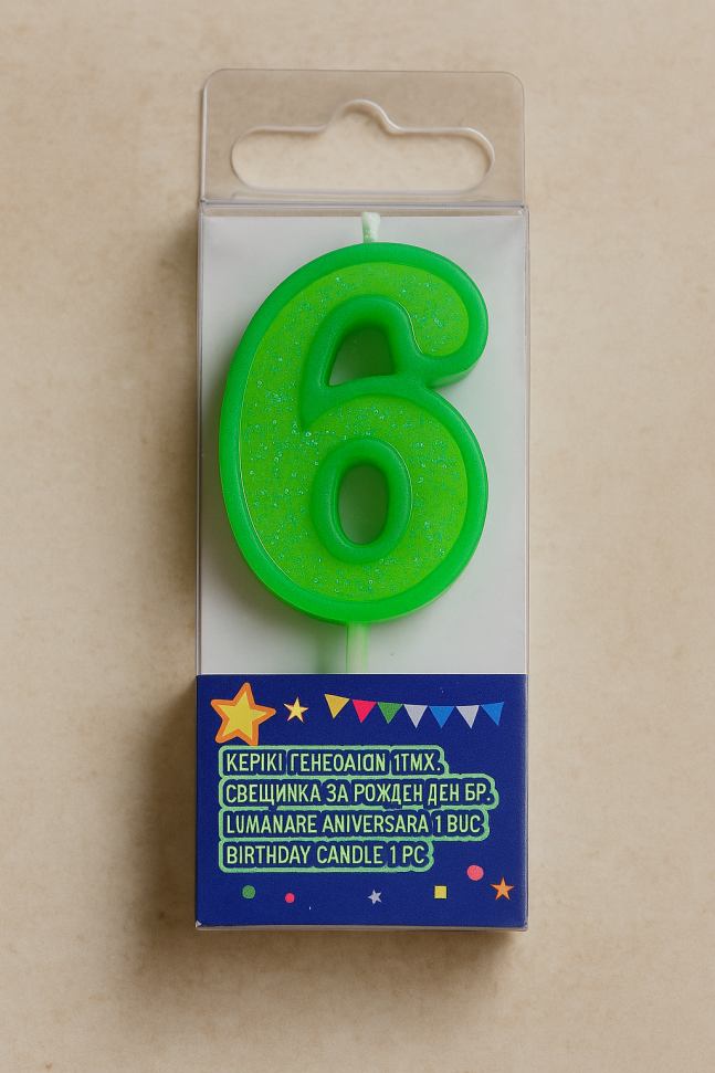 Празнична свещ за торта във формата на цифрата 6 в зелен цвят с блестящи частици брокат, която ще бъде атрактивно допълнение към всяко парти за рожден ден на дете.
