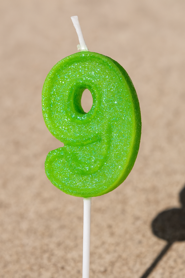 Празнична свещ за торта във формата на цифрата 9 в зелен цвят с блестящи частици брокат, която ще бъде чудесно допълнение към всяко парти за рожден ден на дете.