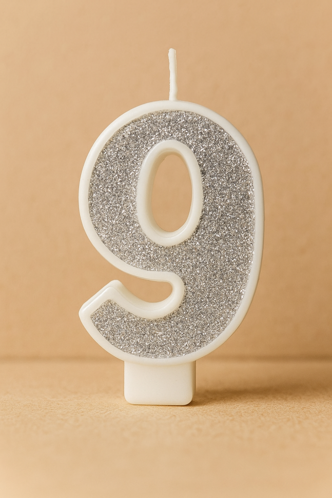 Празнична свещ за торта във формата на цифрата 9 в сребрист цвят с блестящи частици брокат, която ще бъде ефектно допълнение към всяко парти за рожден ден на дете.