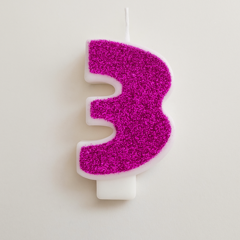Празнична свещ за торта във формата на цифрата 3 в лилав цвят с блестящи частици брокат, която ще бъде колоритно допълнение към всяко парти за рожден ден на дете.