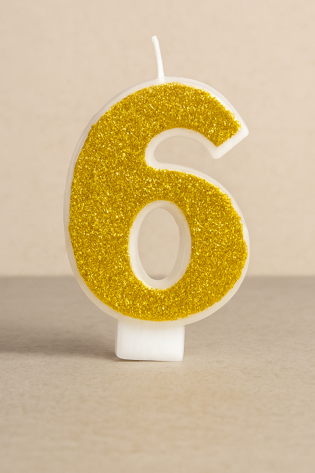 Празнична свещ за торта във формата на цифрата 6 в златист цвят с блестящи частици брокат, която ще бъде уникално допълнение към всяко парти за рожден ден на дете.