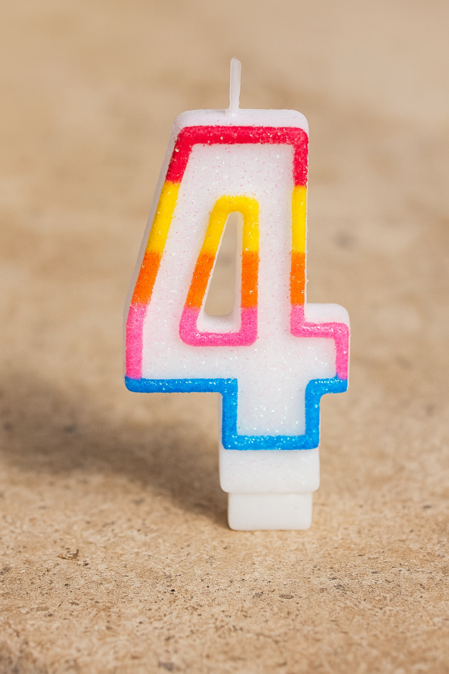 Празнична свещ за торта във формата на цифрата 4 в бял цвят с многоцветна рамка блестящи частици брокат, която ще бъде атрактивно допълнение към всяко парти за рожден ден на дете.