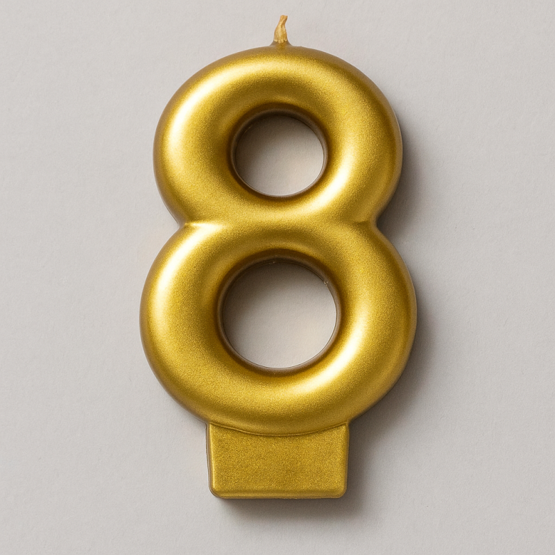 Празнична свещ за торта във формата на цифрата 8 в златист цвят, която ще бъде чудесно допълнение към всяко парти за рожден ден на дете.