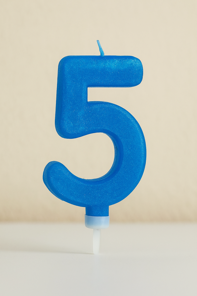 Празнична свещ с поставка за торта за торта във формата на цифрата 5 в син цвят с блестящи частици брокат, която ще бъде забележителен акцент във всяко парти за рожден ден на дете.