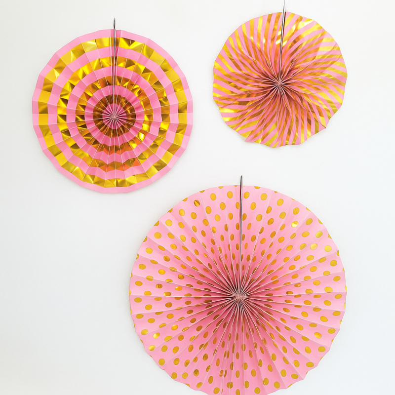 3 броя висящи парти декорации във формата на ветрило, изработена от хартия в розово и златисто.