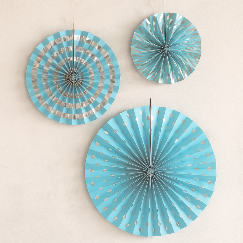3 броя висящи парти декорации във формата на ветрило, изработена от хартия в светло синьо със сребристи акценти.
