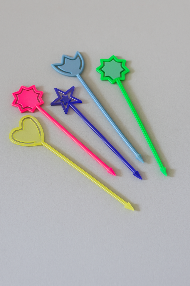 36 броя парти клечки във формата на звезди, сърца и др., изработени от пластмаса в различни ярки цветове.