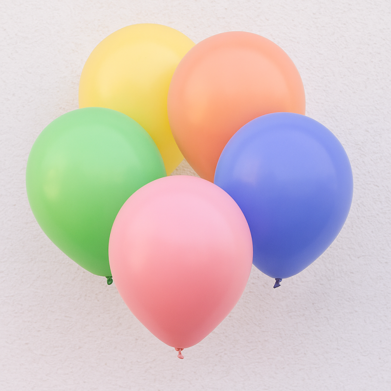 25 броя парти балони, изработени от траен каучук с класическа форма в различни пастелни цветове.