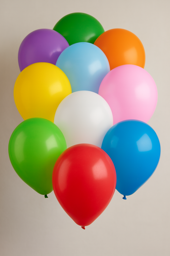 45 броя парти балони, изработени от траен каучук с класическа форма в различни ярки цветове.
