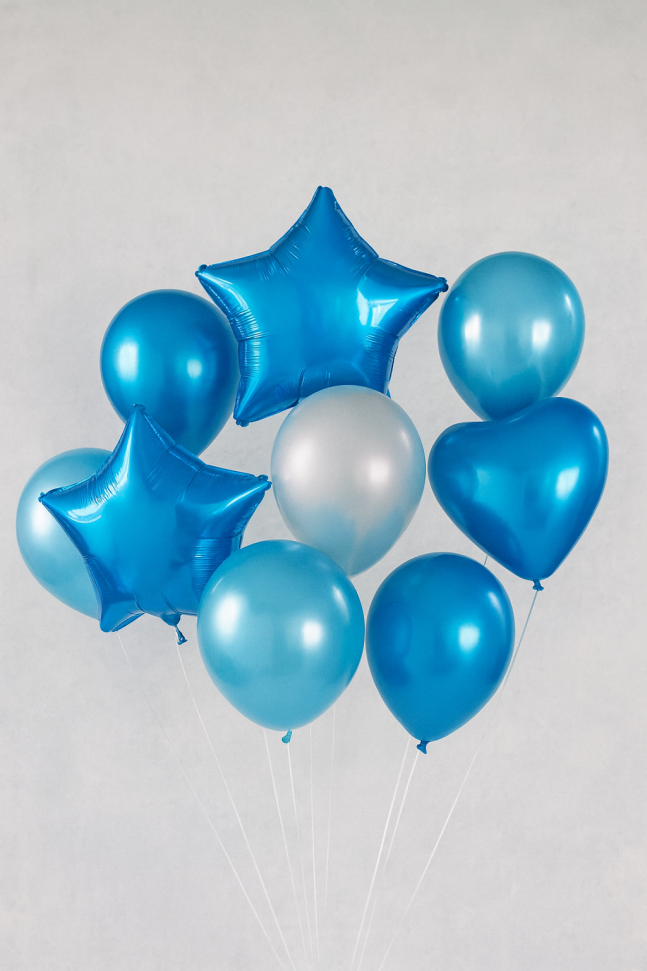 Комплект от 10 броя парти балони в различна форма - 3 балона звезди (37 см.), изработени от фолио в син цвят и 7 кръгли балона (30 см.), изработени от траен каучук в сини нюанси.