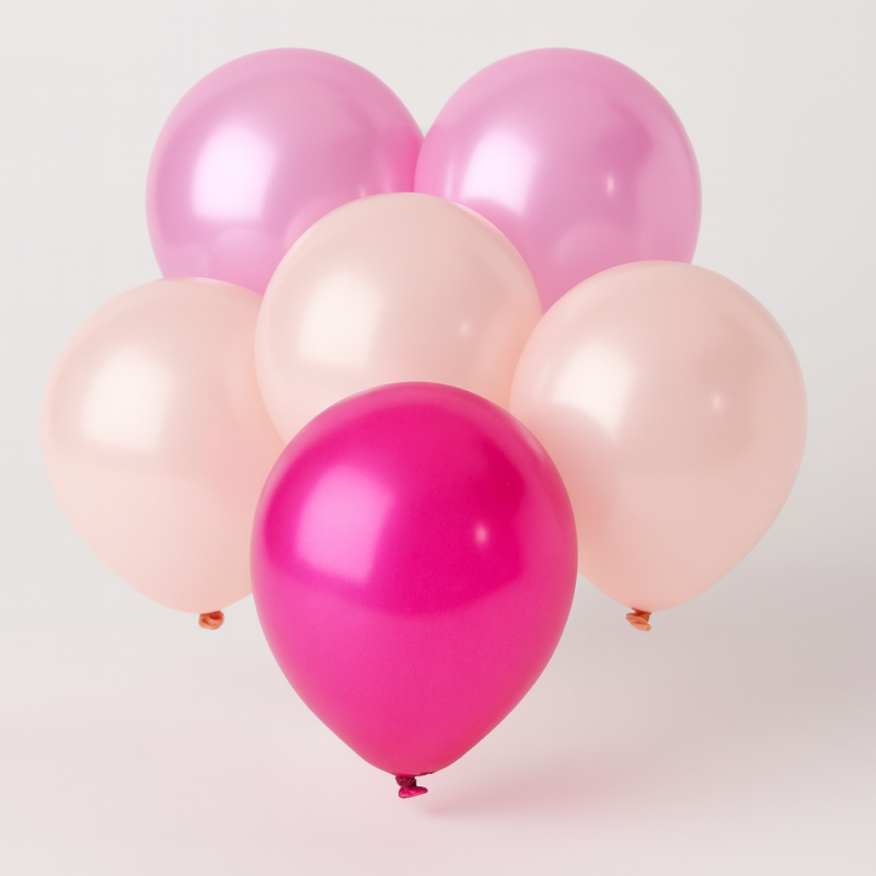 20 броя парти балони, изработени от траен каучук в розово и екрю с металически ефект.