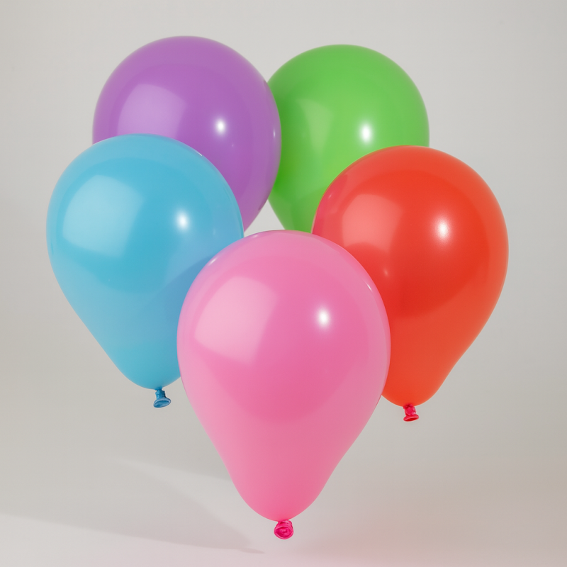 Икономична опаковка от 50 броя парти балони, изработени от траен каучук с класическа форма в различни ярки цветове с металически отблясък.
