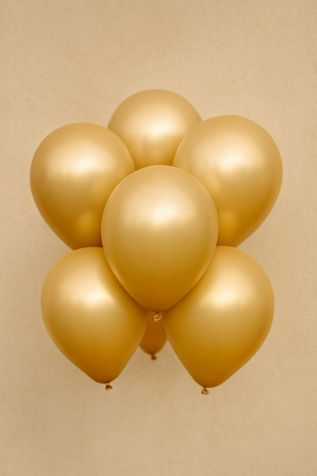 10 броя парти балони, изработени от траен каучук в златист цвят с металически ефект.