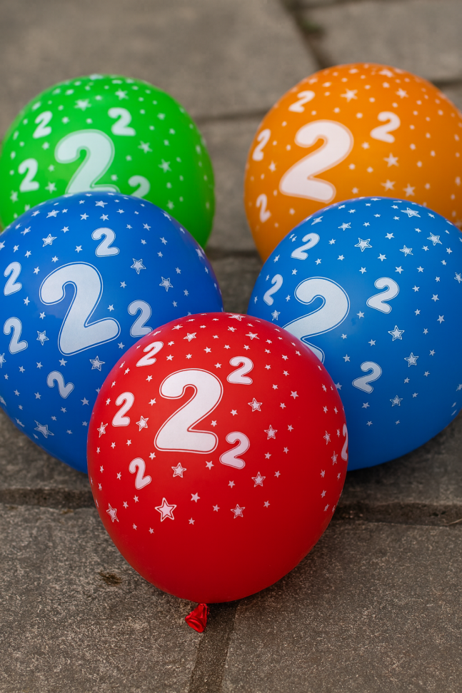 5 броя парти балони, изработени от латекс в различни наситени цветове с щампа на цифрата 2.