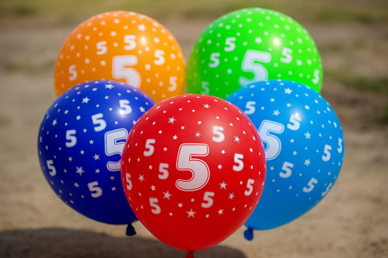 5 броя парти балони, изработени от латекс в различни ярки цветове с щампа на цифрата 5.