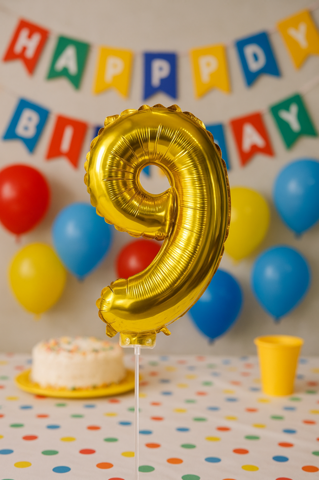 Парти балон, изработен от фолио във формата на цифрата 9 в златист цвят.