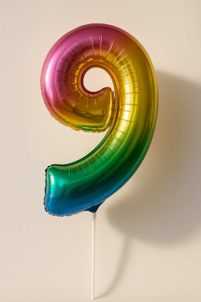 Голям парти балон, изработен от фолио във формата на цифрата 9 в цветовете на дъгата.