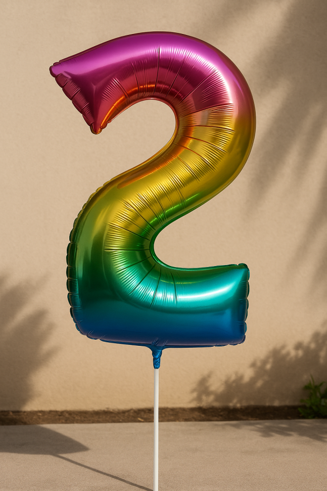 Голям парти балон, изработен от фолио във формата на цифрата 2 в цветовете на дъгата.