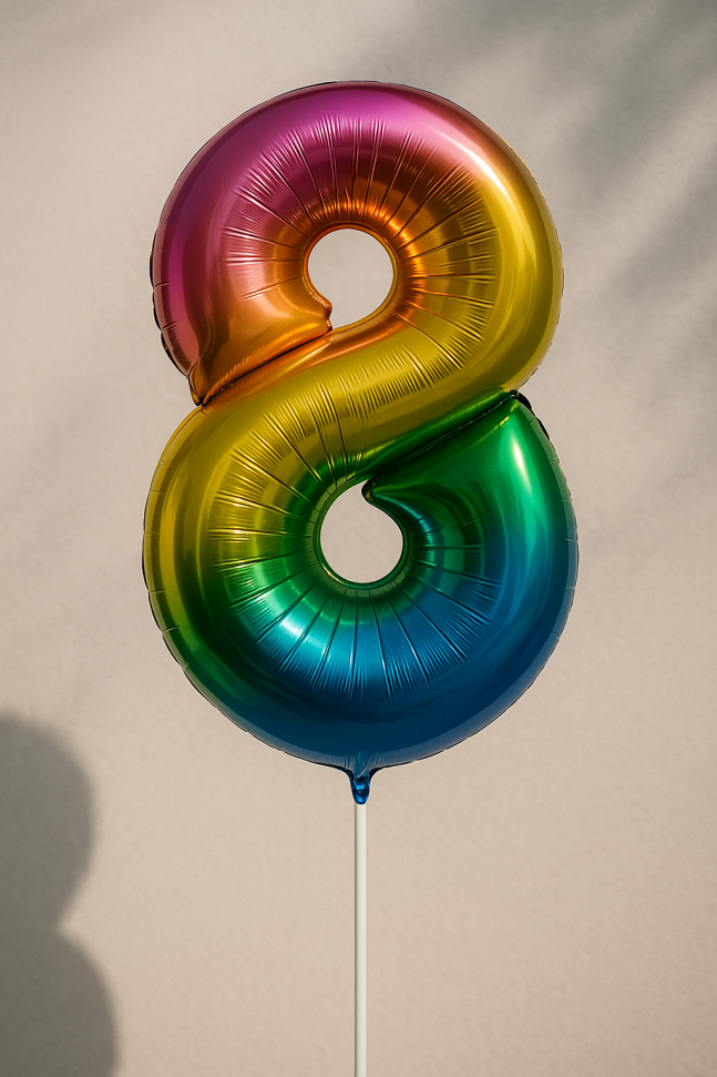 Голям парти балон, изработен от фолио във формата на цифрата 8 в цветовете на дъгата.