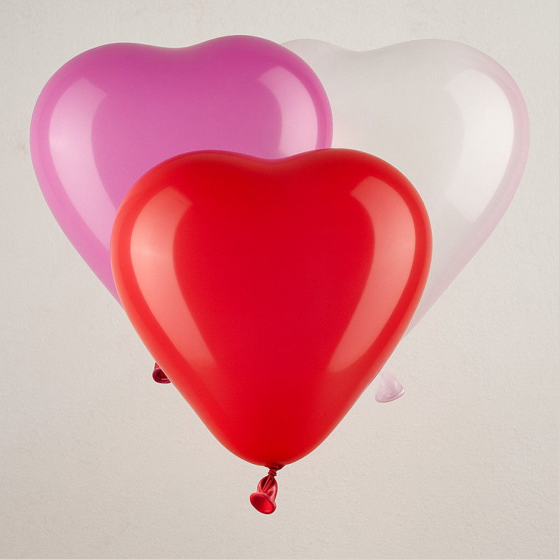 10 броя парти балони, изработени от латекс във формата на сърца в червено, бяло и розово.