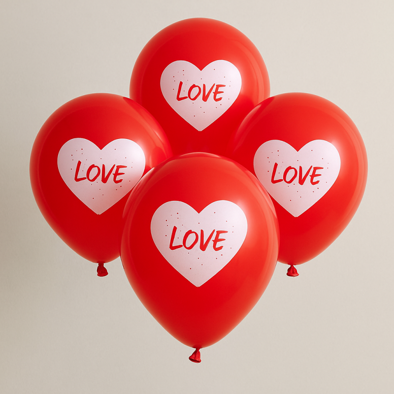 20 броя парти балони, изработени от латекс в червен цвят с щампа на бели сърца с надпис LOVE.