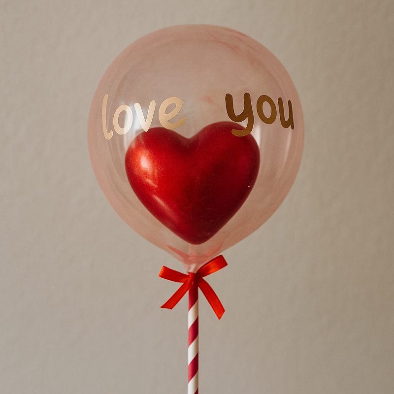 Парти балон, изработен от прозрачен PVC материал с надпис Love you и 6 червени пера вътре.
