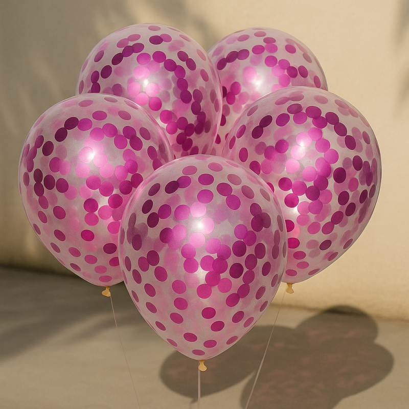 5 броя парти балони, изработени от прозрачен латекс с цикламени конфети вътре.