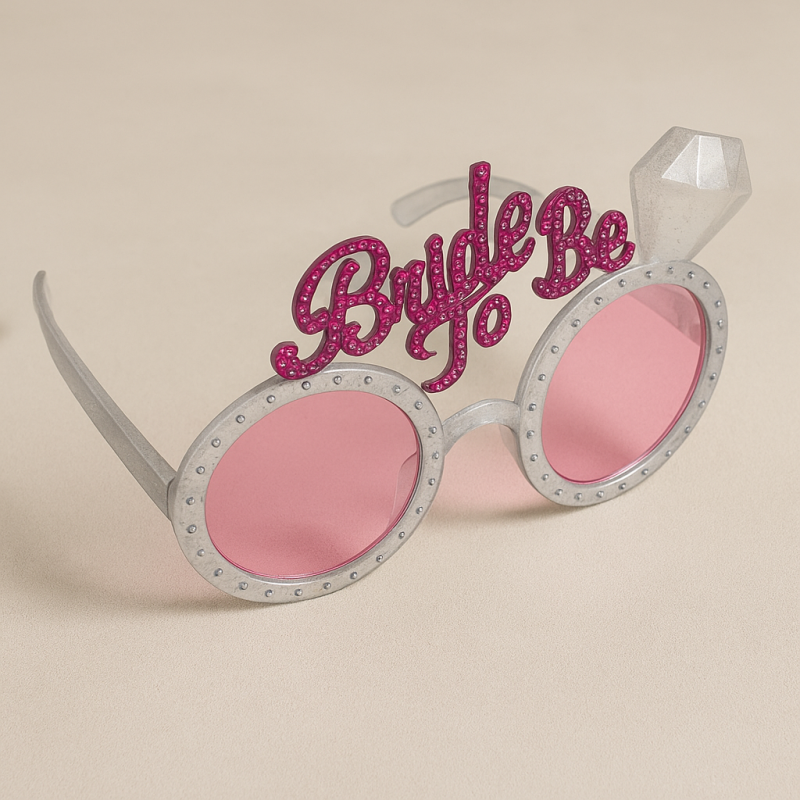 Парти очила с розови стъкла, сребриста рамка и цикламен надпис Bride to be.