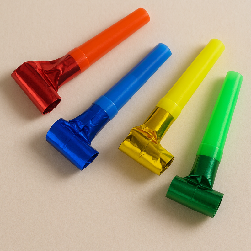 15 броя парти свирки, изработени от пластмаса и хартия в различни ярки цветове с металически отблясък.