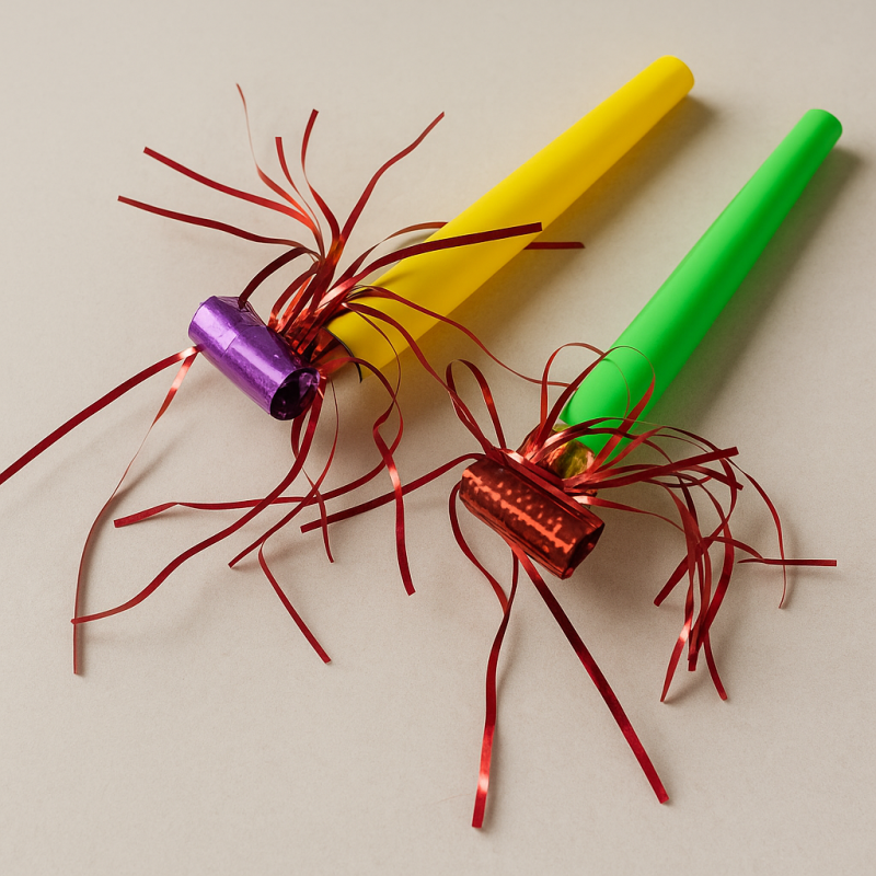 12 броя парти свирки, изработени от пластмаса и хартия в различни ярки цветове с ресни.