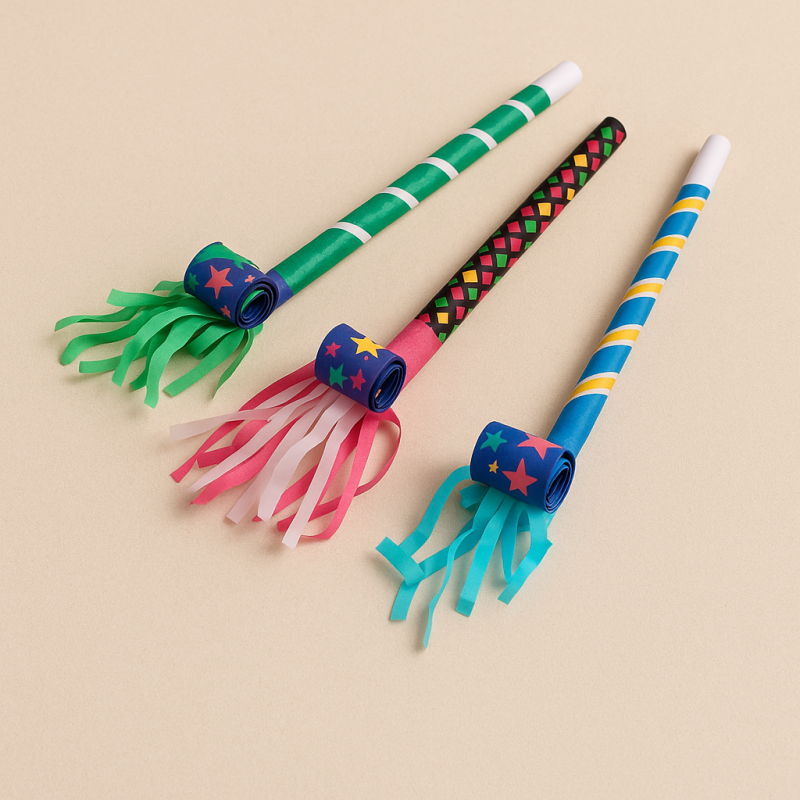 12 броя парти свирки, изработени от пластмаса и хартия с разноцветни шарки с ефектни цветни ресни.