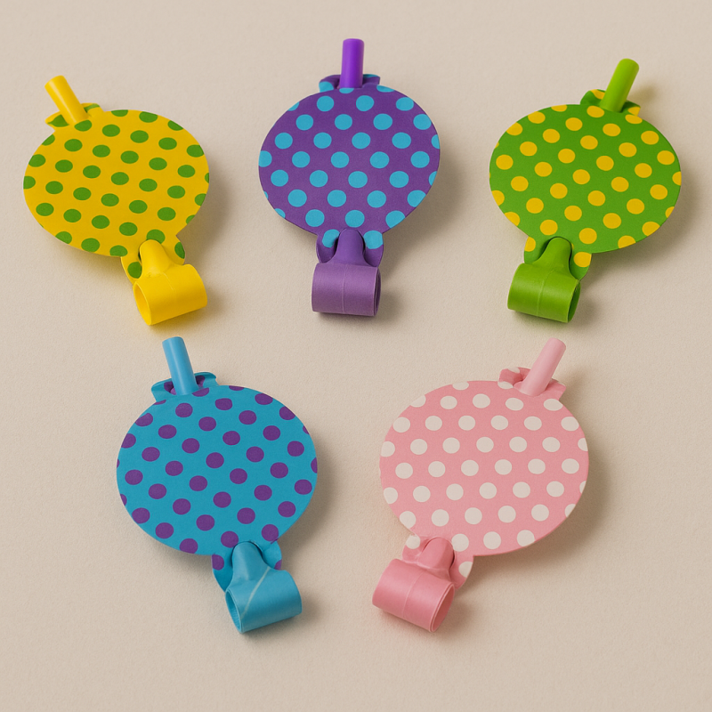 10 броя парти свирки, изработени от пластмаса и хартия в различни неонови цветове с принт на точки.