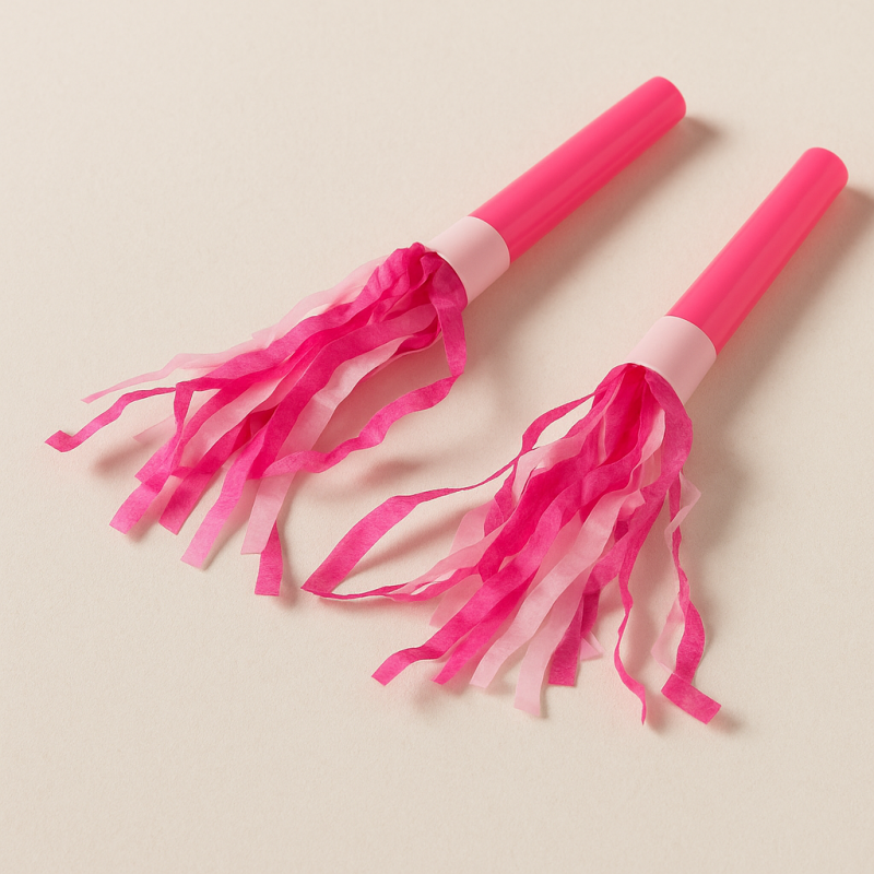6 броя парти свирки, изработени от пластмаса и хартия в розови нюанси с ресни.
