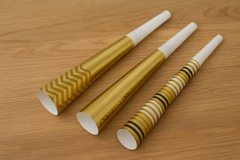 6 броя парти свирки тип тромби, изработени от пластмаса и картон със златисти шарки.