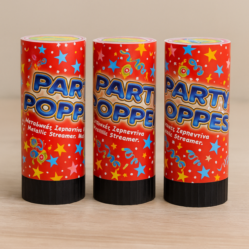 Комплект от 3 броя цилиндри с многоцветни металик лентички и конфети с въздух под налягане, който ги изстрелва.