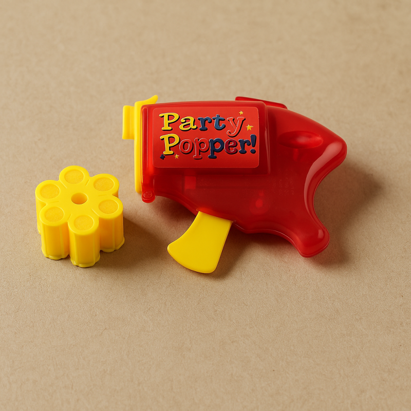 Парти пистолет, изработен от пластмаса в червено и жълто, който изстрелва 6 изстрела с разноцветни конфети.
