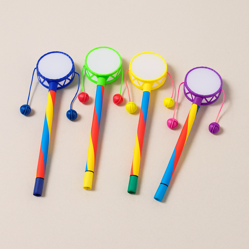 Парти свирка във формата на музикален инструмент там-там, която издава звук и е изработена от пластмаса в различни ярки цветове.