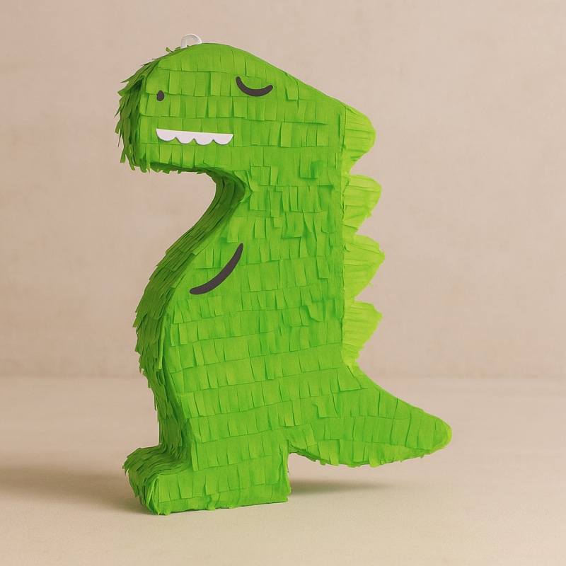 Парти аксесоар пинята, изработен от хартия и картон във формата на симпатичен динозавър в зелен цвят.
