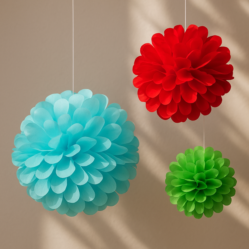 Комплект от 3 броя висящи парти декорации във формата на топка, изработени от хартия в светло синьо, зелено и червено.